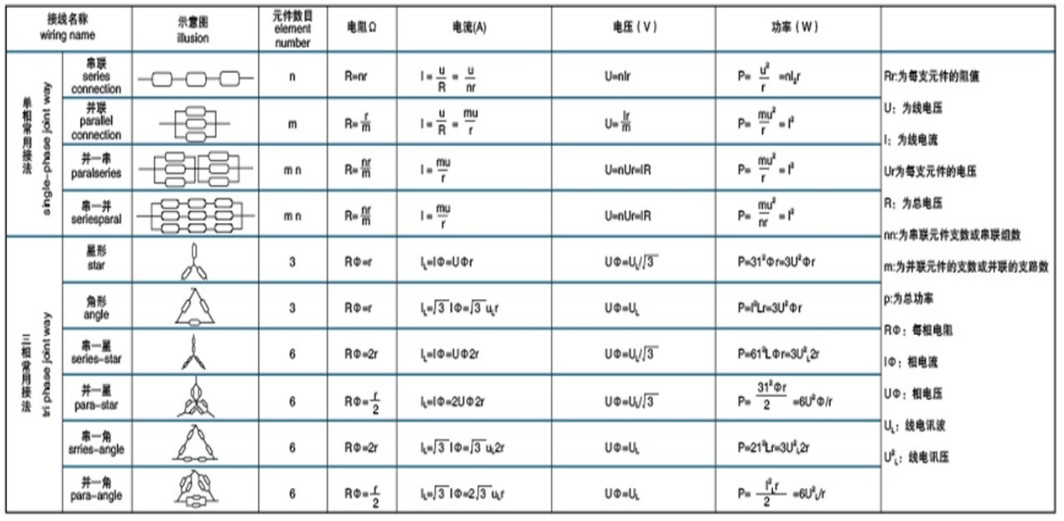 硅碳棒元件的聯(lián)結(jié)方式可串可并,以并聯(lián)使用為優(yōu)。串聯(lián)使用時,支路串聯(lián)支數(shù)不宜多于3支,常用聯(lián)結(jié)方式及其計算公式列于下表: